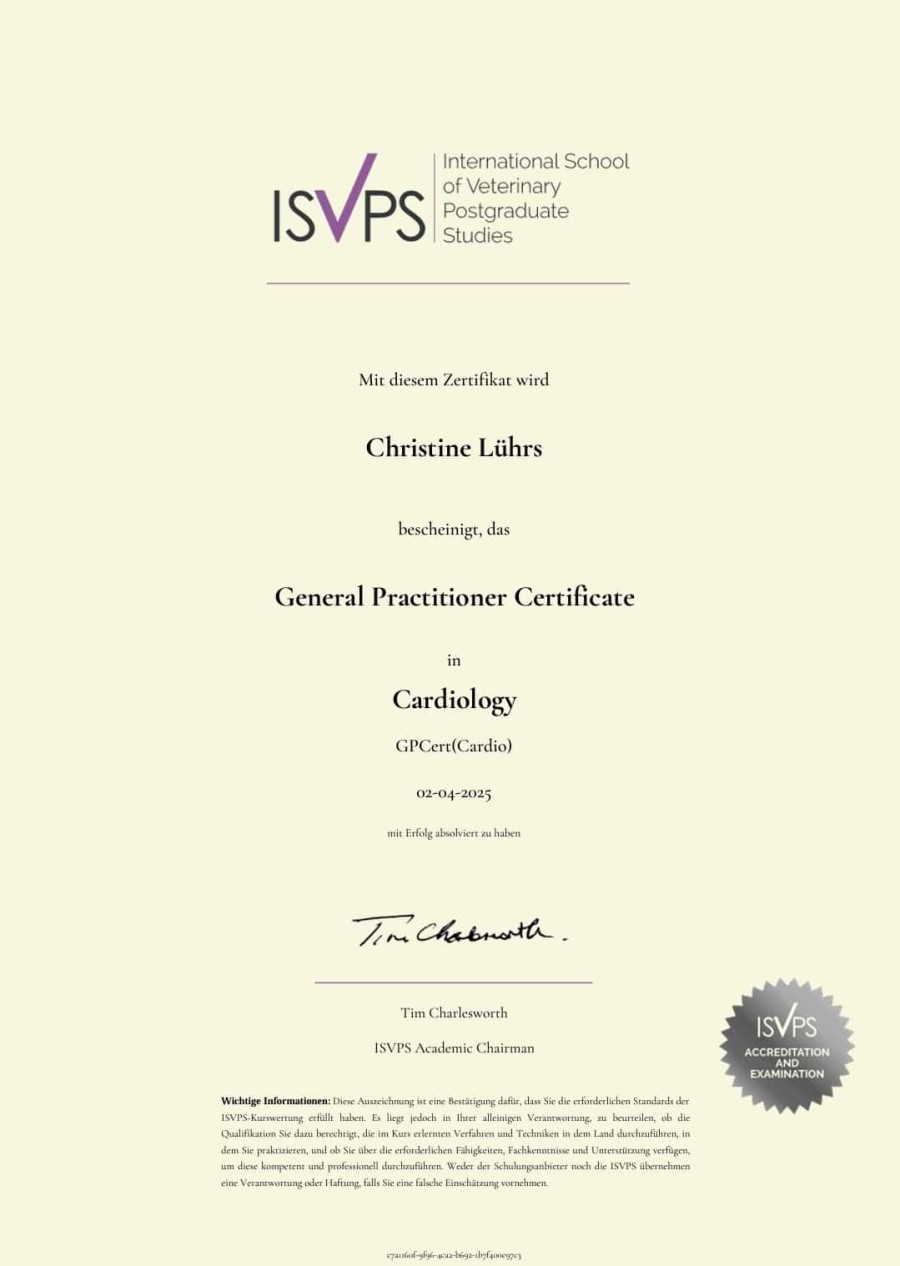 Bei der Routineuntersuchung festgestellte Herzgeräusche sollten immer mittels Herzultraschall abgeklärt werden. Nicht bei jeder Erkrankung ist im Anfangsstadium bereits die Einnahme von Medikamenten nötig. Oft reicht es aus alle 6-24 Monate einen Kontrollultraschall des Herzens zu machen, um zu entscheiden wie weit fortgeschritten die Herzerkrankung ist.