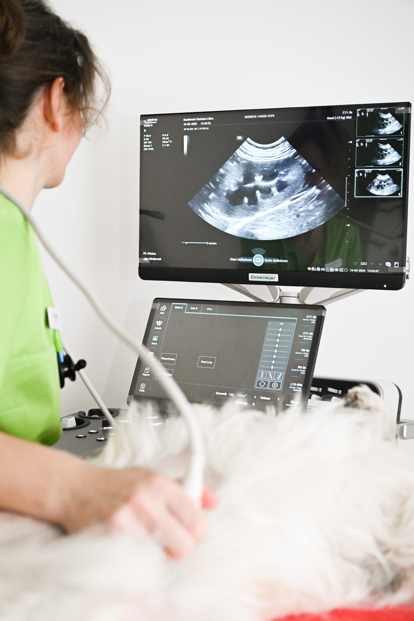 • Ihr Tier wird für die nötige Bildqualität am gesamten Bauch geschoren -vom Becken bis zum Brustkorb